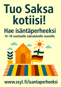 Suomi-Saksa Yhdistysten liitto hakee kymmenille Suomesta kiinnostuneille vaihto-oppilaille isäntäperheitä Suomesta. Samalla kun toimit suomalaisen kielen ja kulttuurin lähettiläänä, pääset itsekin kielikylpyyn ja opit vaihto-oppilaalta hänen kulttuuristaan.