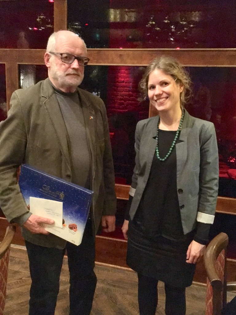 Tuusulanjärven Suomi-Saksa yhdistys juhli lauantaina 28. lokakuuta 20-vuotista yhdistystoiminaansa. Merkkipäivän vietto aloitettiin Helsingin Kaupunginteatterissa Juha Vakkurin Mannerheim ja saksalainen suudelma -näytelmällä. Ennen näytöstä näytelmän käsikirjoittaja Juha Vakkuri kertoi näytelmän synnystä ja omasta käsikirjoitustyöstään. Vaikuttavan teatterielämyksen jälkeen juhlaväki jatkoi illanviettoa läheisessä Graniittilinnassa. Kuvassa SSYL:n vs. toiminnanjohtaja Paula Schuth onnittelee Tuusulanjärven yhdistyksen puheenjohtaja Sakari Heikkilää sveitsiläisen suklaan voimin.